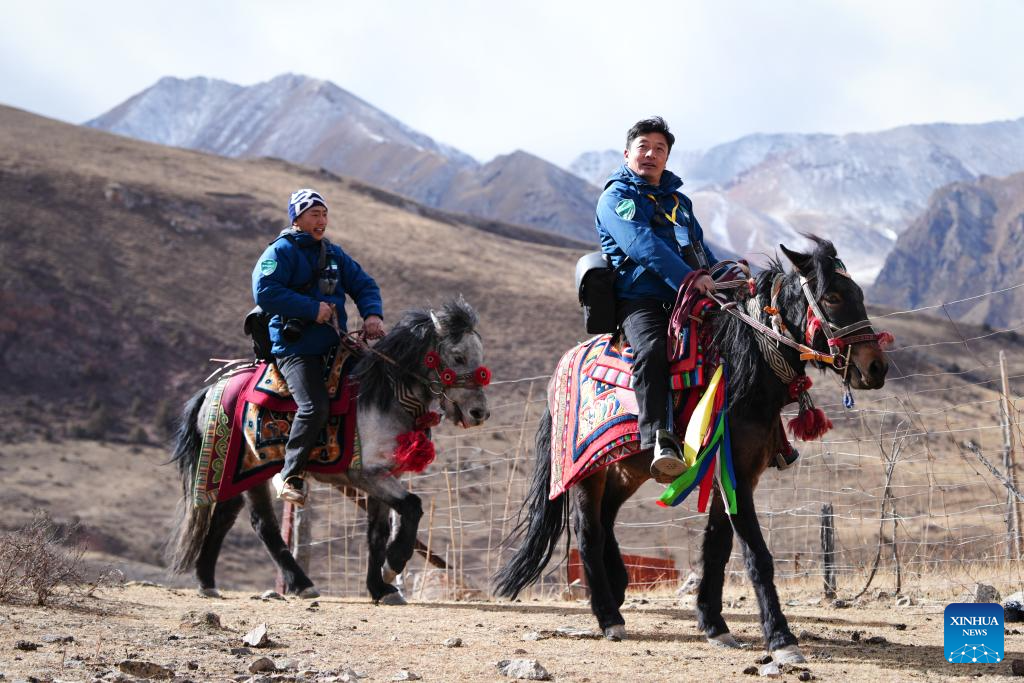 (260204) -- YUSHU, Feb. 4, 2026 (Xinhua) -- Tseten (L) and Kunga patrol in Angsai Township of Zaduo County, Yushu Tibetan Autonomous Prefecture, northwest China's Qinghai Province, Jan. 29, 2026. Amid snow-capped mountains and deep valleys in Angsai Township of Zaduo County, an area in Sanjiangyuan National Park, Tseten and Kunga trek over ridges, cross alpine meadows and carry out ecological patrols, pressing the shutter as they move through the landscape.