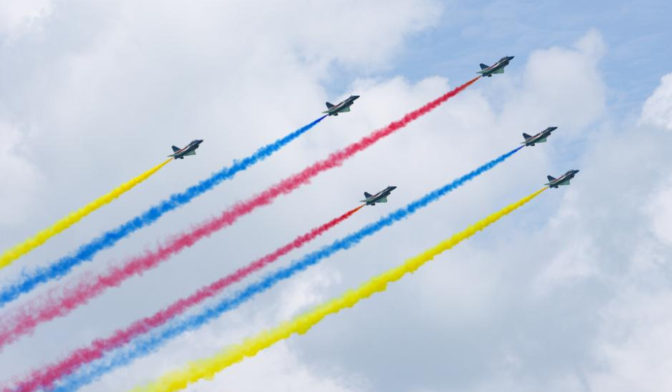 Aircraft of the Bayi Aerobatic Team of the Chinese People's Liberation Army (PLA) Air Force perform during the 10th Singapore Airshow in Singapore, Feb. 4, 2026. The 10th Singapore Airshow opened on Tuesday at the Changi Exhibition Center. The airshow runs until Feb. 8, with the Bayi Aerobatic Team of the Chinese People's Liberation Army (PLA) Air Force delivering flight displays. (Photo by Zhu Jianghai/Xinhua)