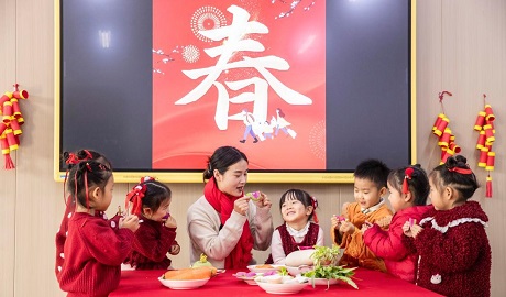 Photo taken on Feb. 3, 2026 shows children learning to make spring rolls under teachers' guidance at Xinghe Nursery Center in Hai'an City, east China's Jiangsu Province, while listening to stories about the Beginning of Spring. (Gu Binbin/Guangming Picture)