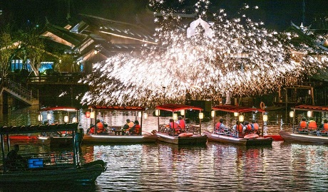 Photo taken on Feb. 4, 2026 shows tourists taking boats to watch a Da Tie Hua performance at Nanyueli Food Culture Street in Nanyue District, Hengyang City, central China's Hunan Province. During the show, molten iron was cast into the air, bursting into showers of golden sparks and illuminating the Spring Festival night, attracting large numbers of residents and visitors. (He Huawen/Guangming Picture)