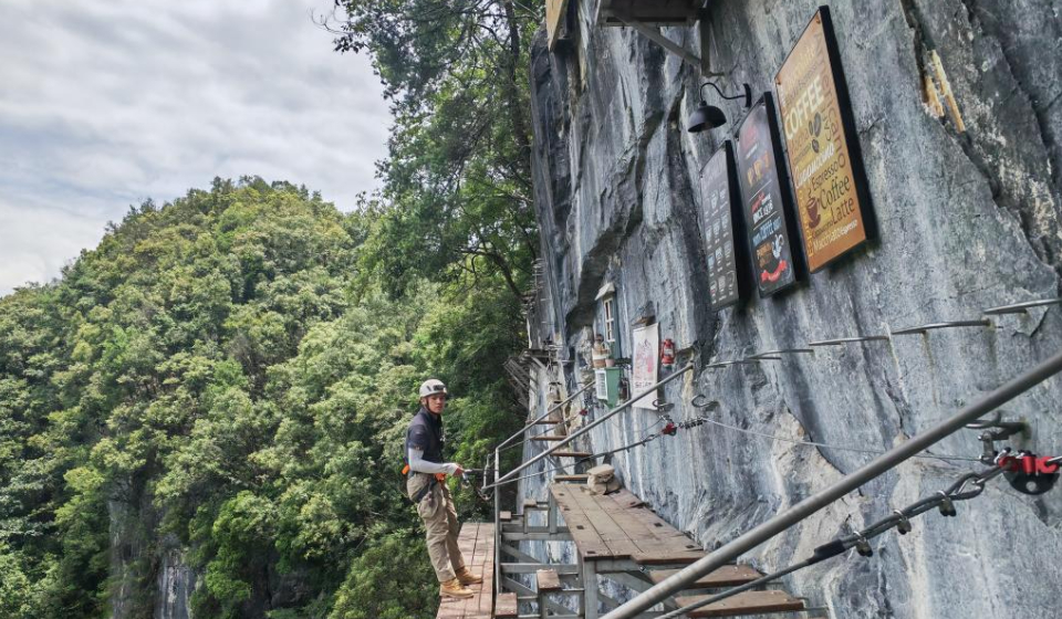With the forest canopy far below and the metallic clink of carabiners on steel cables ringing in her ears, a coffee enthusiast surnamed Li, from the provincial capital city Guiyang, finally reached the caf's wooden platform after a grueling 30-minute via ferrata climb.