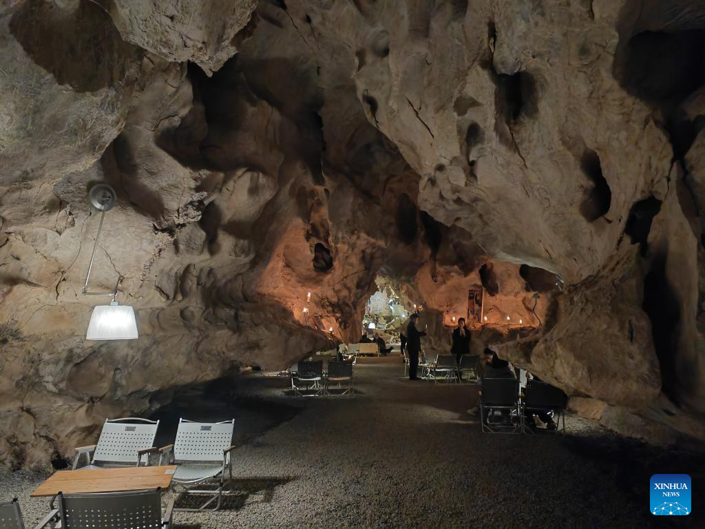 This photo taken on Nov. 23, 2025 shows an interior view of Xiu Caf, a coffeehouse built inside a natural karst cave in Xiuwen County, southwest China's Guizhou Province. (Xinhua/Wu Si)