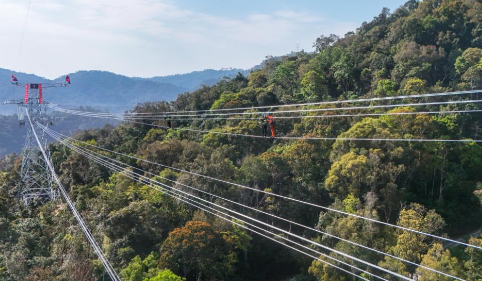 A drone assists during the line-connecting operation of the Chinese and Lao sections of the China-Laos 500-kV power interconnection project on Feb. 5, 2026. The Chinese and Lao sections of the China-Laos 500-kV power interconnection project were physically connected on Thursday, marking a major step forward in putting the project into operation. (Xinhua/Peng Yikai)