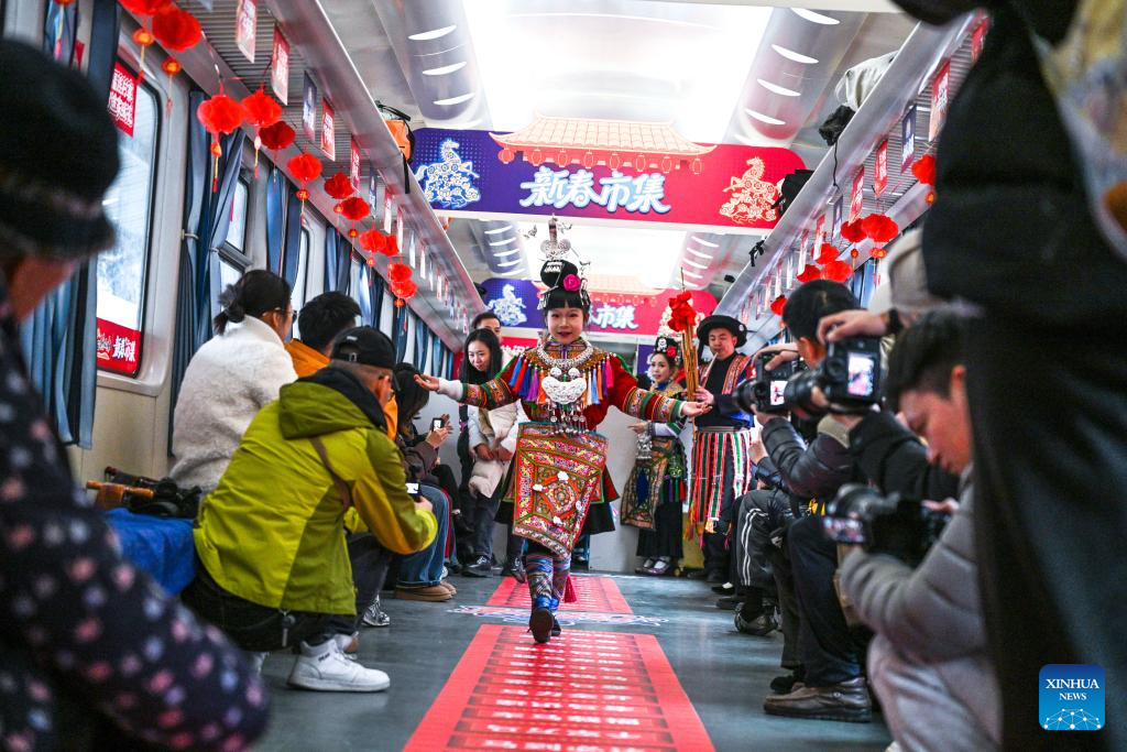 An actor plays Lusheng, a traditional reed-pipe wind instrument, on the train No. 5640 in southwest China's Guizhou Province on Feb. 8, 2026. The train No. 5640 runs in Guizhou Province between Yuping Dong Autonomous County of Tongren City and provincial capital Guiyang City. It connects more than 100 ethnic minority villages along the route and makes travel more convenient for the villagers.