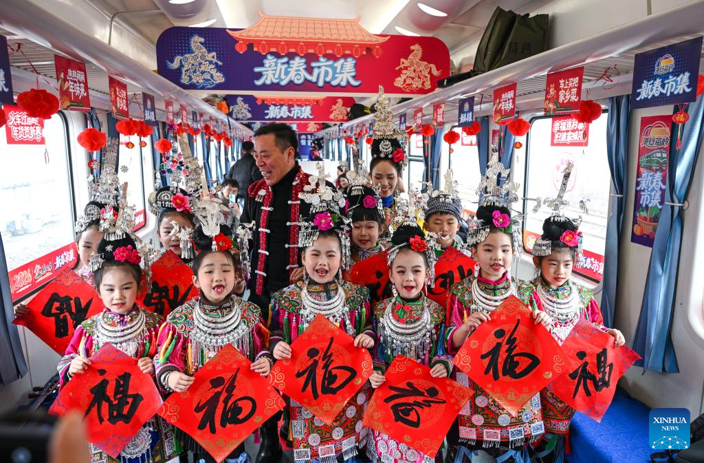 Children send New Year greetings on the train No. 5640 in southwest China's Guizhou Province on Feb. 8, 2026. The train No. 5640 runs in Guizhou Province between Yuping Dong Autonomous County of Tongren City and provincial capital Guiyang City. It connects more than 100 ethnic minority villages along the route and makes travel more convenient for the villagers.
