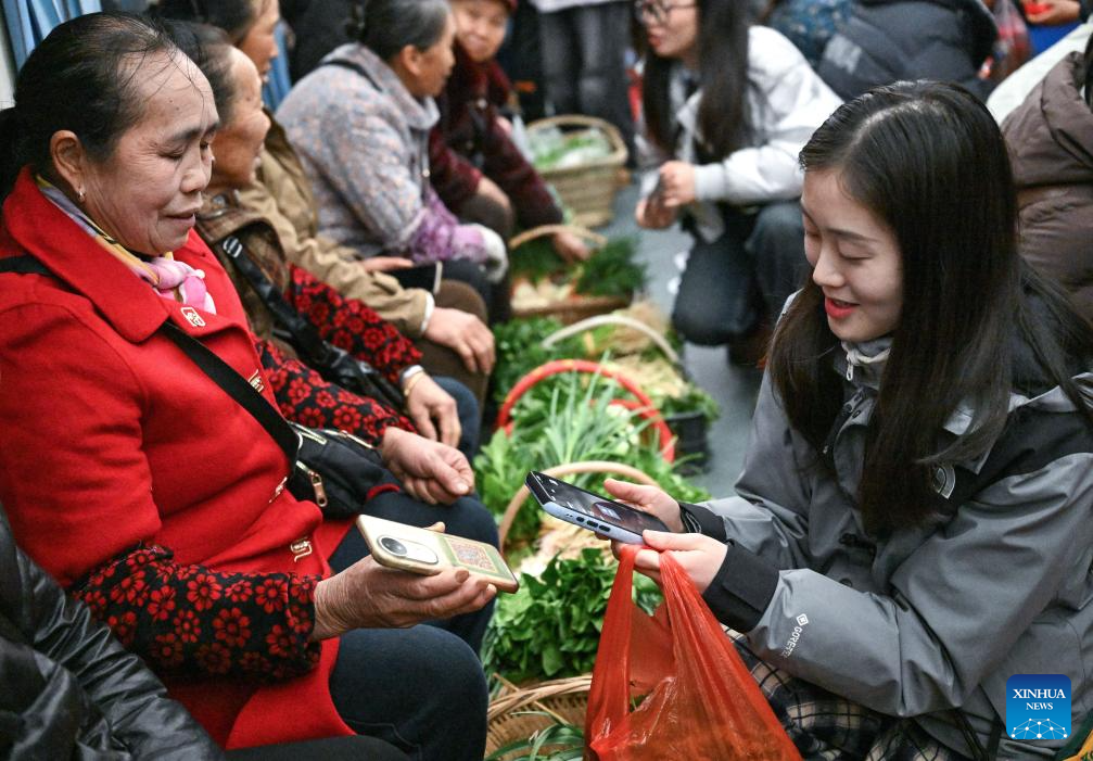 A New Year market has been introduced on the train No. 5640 upon the upcoming Chinese New Year, during which fresh agricultural products and folk customs were displayed for passengers along the way. (Xinhua/Yang Wenbin)