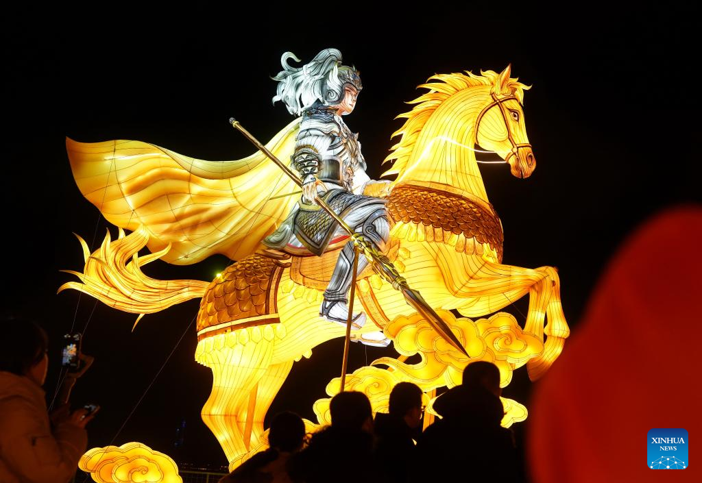 People watch a giant lantern for the upcoming Spring Festival in Lanzhou, northwest China's Gansu Province, Feb. 10, 2026. With the Spring Festival approaching, festive events are held across China to usher in the holiday. (Xinhua/Lang Bingbing)