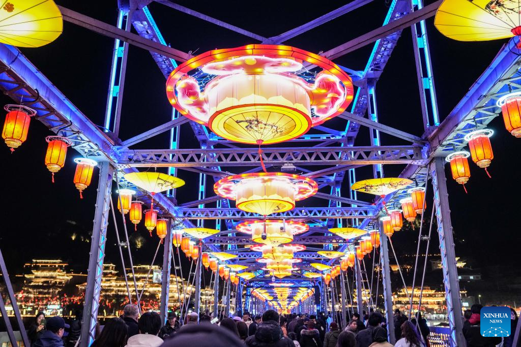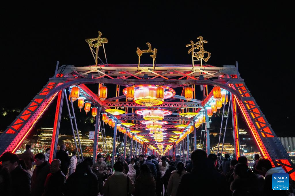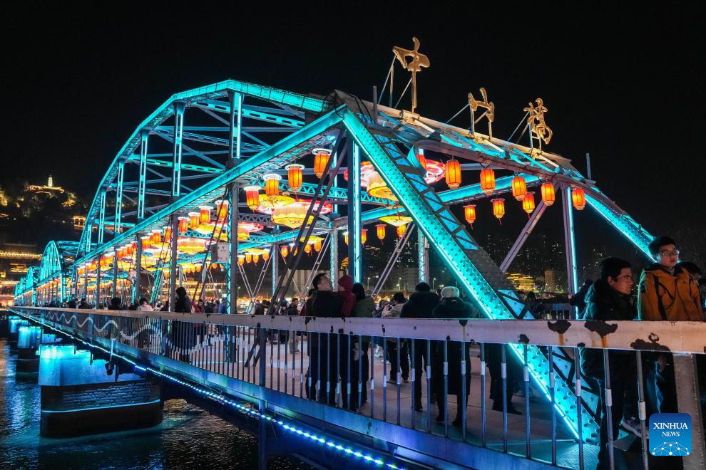 People visit the Zhongshan bridge decorated with lanterns in Lanzhou, northwest China's Gansu Province, Feb. 10, 2026. With the Spring Festival approaching, festive events are held across China to usher in the holiday. (Xinhua/Lang Bingbing)