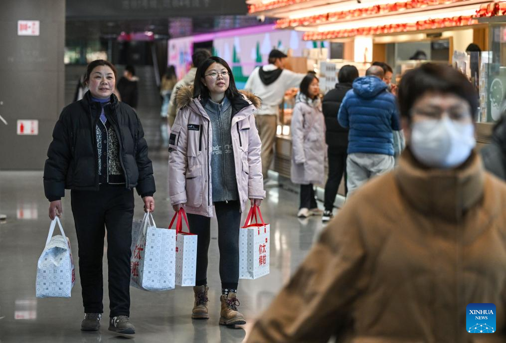 Customers with shopping bags are pictured at a shopping mall in Beijing, capital of China, Feb. 11, 2026. China's consumer price index (CPI), a main gauge of inflation, edged up 0.2 percent year on year in January, official data showed on Wednesday. (Xinhua/Chen Yehua)