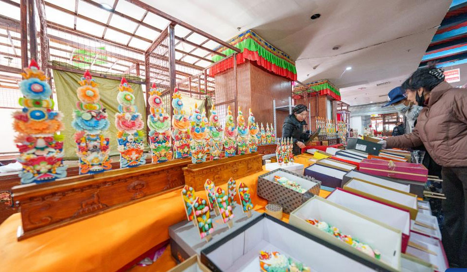 People shop for butter sculptures at a stall in a local market in Lhasa, southwest China's Xizang Autonomous Region, Feb. 12, 2026. Butter sculptures in vivid shapes of trees, flowers, birds, stars, etc., are gradually gaining popularity in the markets across the city ahead of the Tibetan New Year.