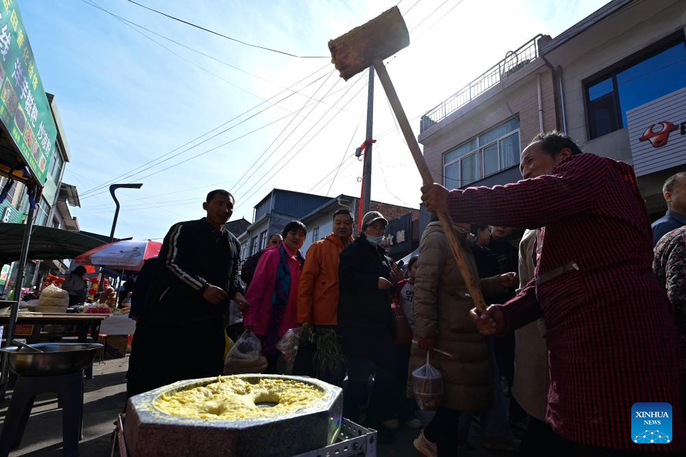 People watch a man making glutinous rice cake at the Jiaodai Market in Jiaodai Town of Lantian County, northwest China's Shaanxi Province, Feb. 13, 2026. The Jiaodai Market, located on a key route over the Qinling Mountains, has been a trading hub for mountain produces since ancient times.