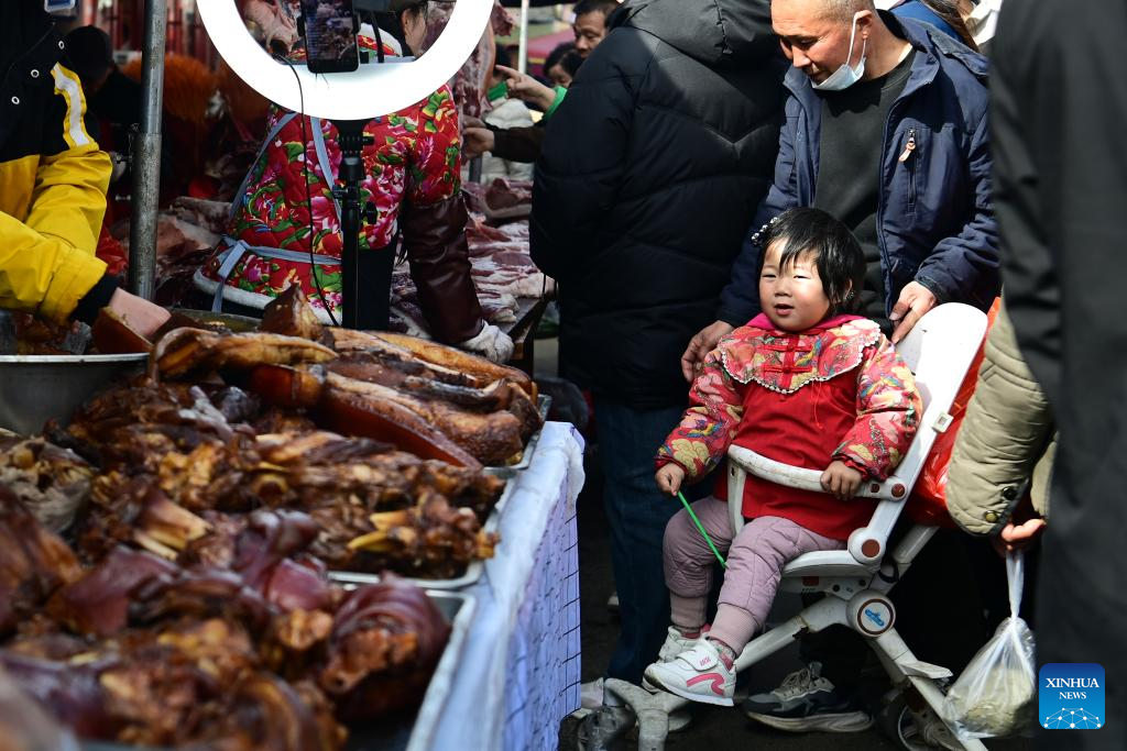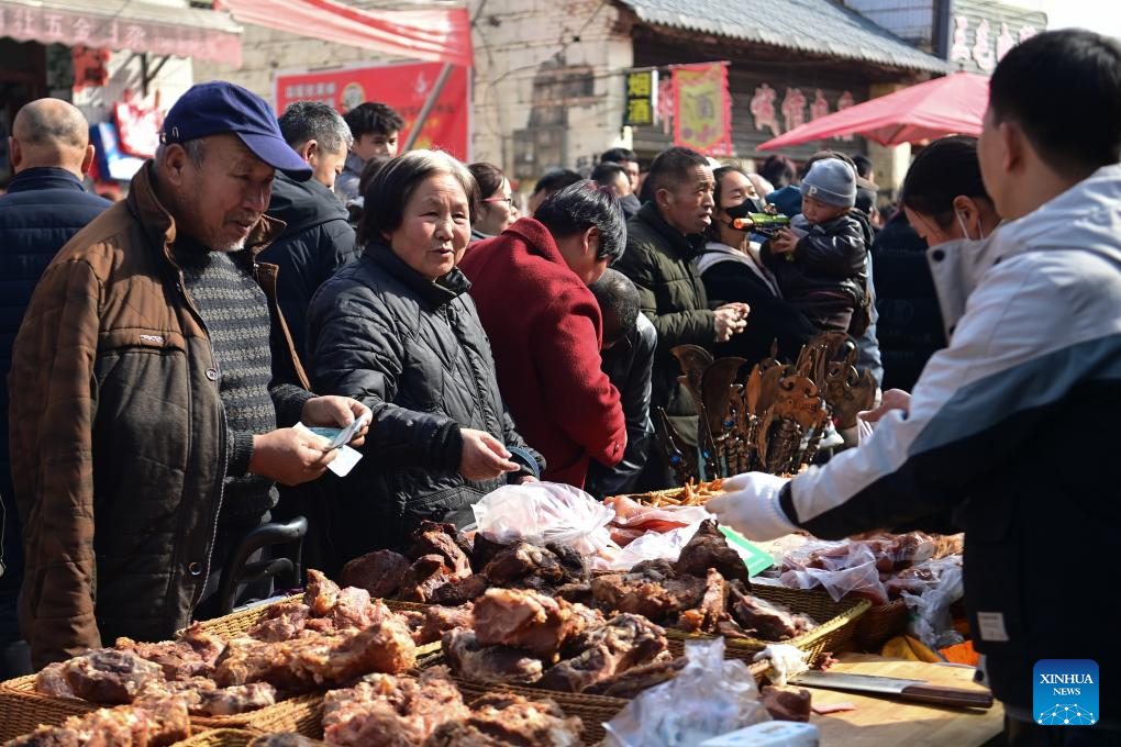People shop for foods at the Jiaodai Market in Jiaodai Town of Lantian County, northwest China's Shaanxi Province, Feb. 13, 2026. The Jiaodai Market, located on a key route over the Qinling Mountains, has been a trading hub for mountain produces since ancient times.