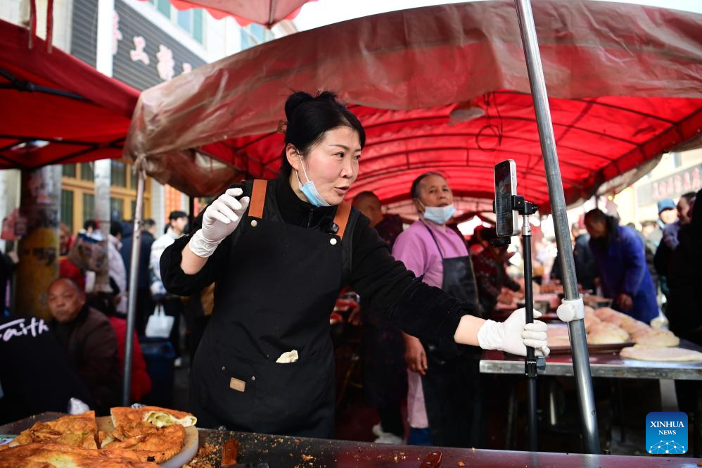 A vendor promotes local food via live-streaming at the Jiaodai Market in Jiaodai Town of Lantian County, northwest China's Shaanxi Province, Feb. 13, 2026. The Jiaodai Market, located on a key route over the Qinling Mountains, has been a trading hub for mountain produces since ancient times.