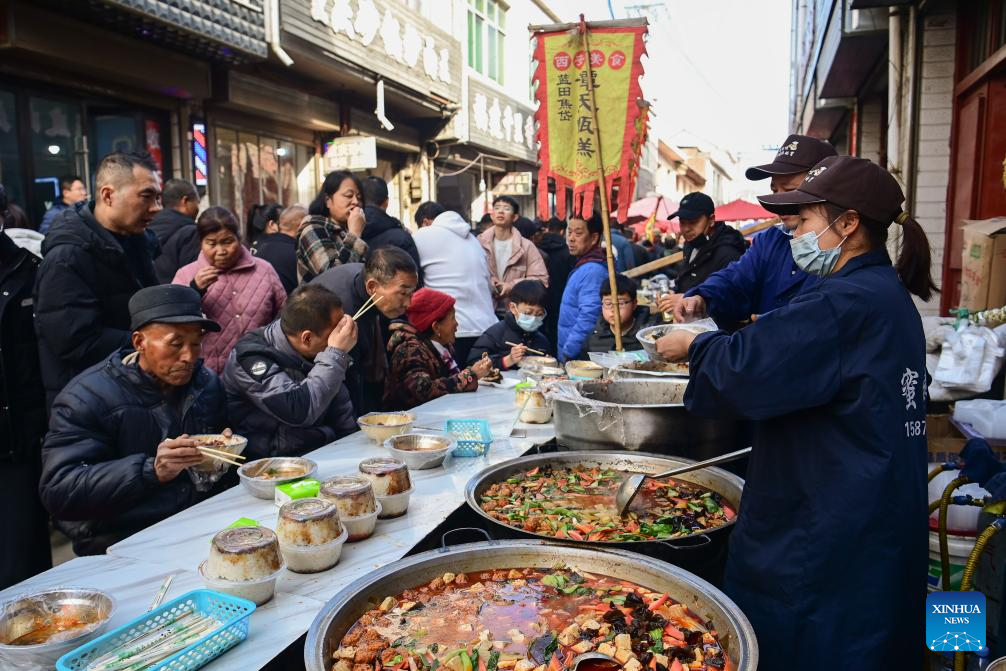 People taste local cuisine at the Jiaodai Market in Jiaodai Town of Lantian County, northwest China's Shaanxi Province, Feb. 13, 2026. The Jiaodai Market, located on a key route over the Qinling Mountains, has been a trading hub for mountain produces since ancient times.
