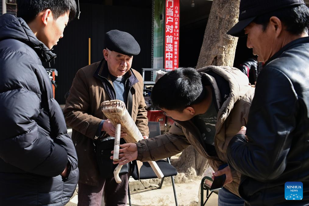 A craftsman (2nd L) shows a handmade bench to a customer at the Jiaodai Market in Jiaodai Town of Lantian County, northwest China's Shaanxi Province, Feb. 13, 2026. The Jiaodai Market, located on a key route over the Qinling Mountains, has been a trading hub for mountain produces since ancient times.