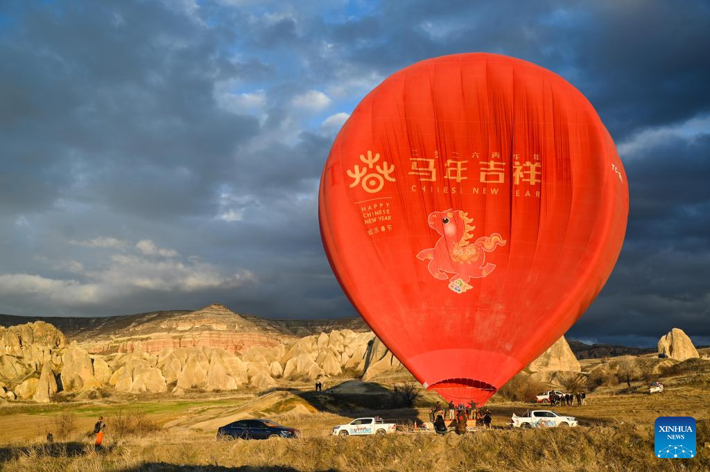 A hot air balloon themed on the Chinese Year of the Horse is inflated during a Chinese Spring Festival celebration in Cappadocia, Trkiye, Feb. 14, 2026. (Xinhua/Liu Lei)