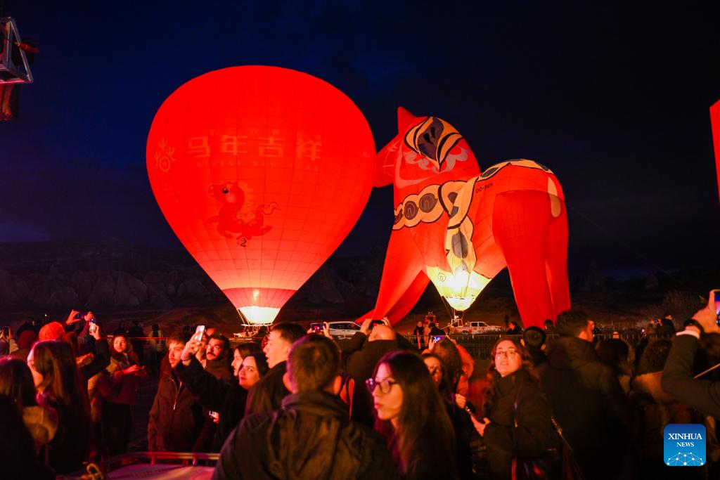 Hot air balloons themed on the Chinese Year of the Horse are inflated during a Chinese Spring Festival celebration in Cappadocia, Trkiye, Feb. 14, 2026. (Xinhua/Liu Lei)