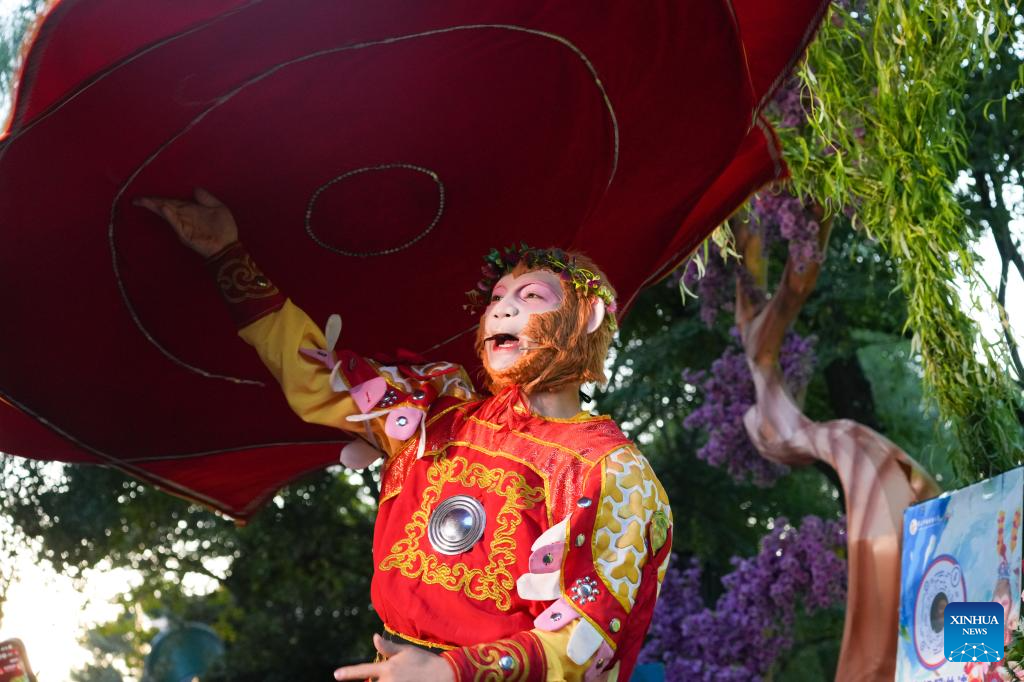 Wang Qingfeng acting as the "Xuebing Monkey", or rice-cracker monkey, performs at the Changchun Zoological and Botanical Park in Changchun, northeast China's Jilin Province, Sept. 18, 2025. (Xinhua)