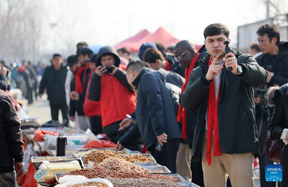 Umar Suleimanov, a 26-year-old Tajik student from Nankai University, records a vlog at a time-honored fair in Jizhou, north China's Tianjin Municipality, Feb. 10, 2026. (Xinhua/Li Ran)