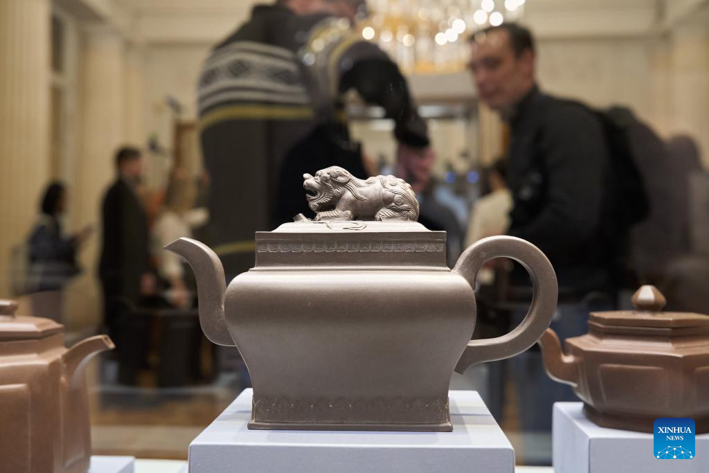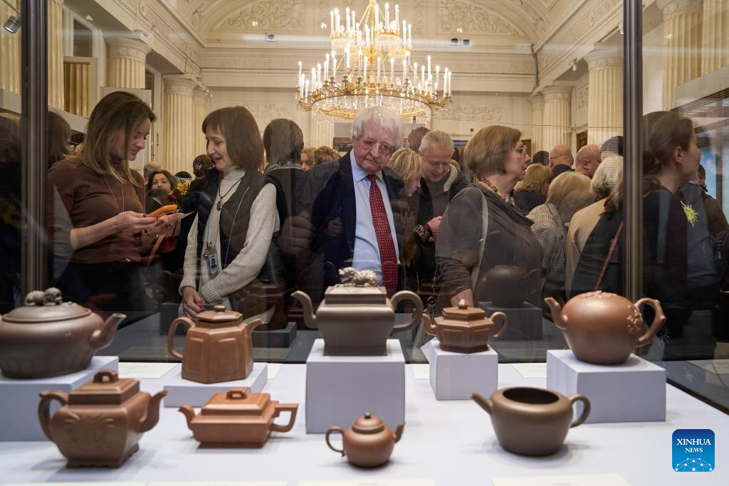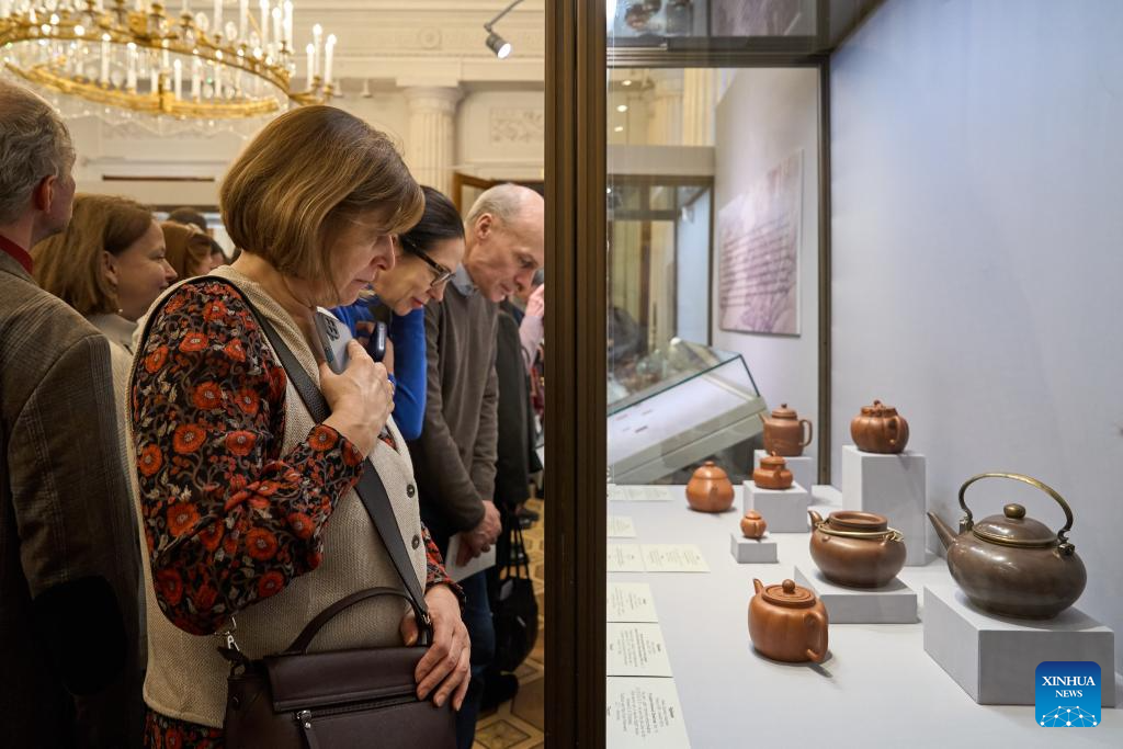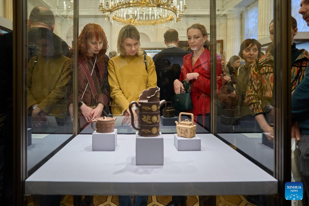 People visit a collection exhibition of Chinese Yixing ceramics at the State Hermitage Museum in St. Petersburg, Russia, Feb. 14, 2026. (Photo by Guo Feizhou/Xinhua)