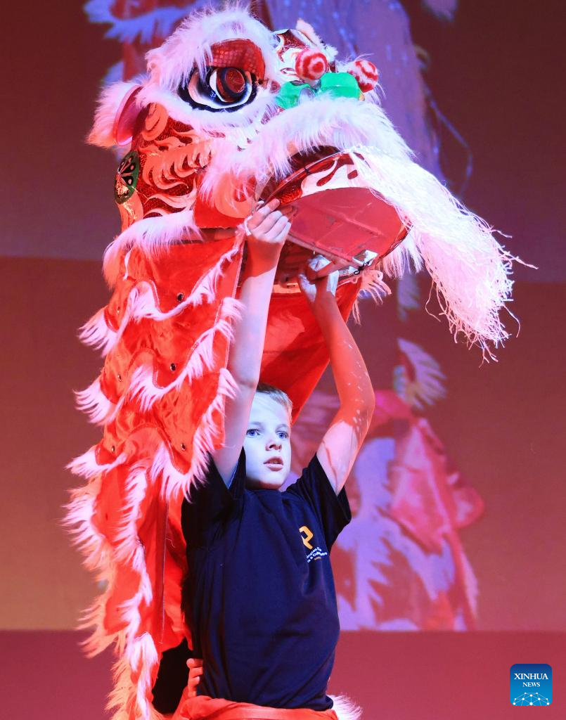 A child performs lion dance during a Spring Festival celebration in Wellington, New Zealand, Feb. 22, 2026. (Photo by Meng Tao/Xinhua)