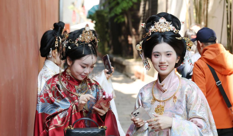 Girls in traditional costumes enjoy themselves at the Shangxiahang traditional block in Fuzhou, southeast China's Fujian Province, Feb. 21, 2026. People wearing traditional costumes enlightened historic blocks in Fuzhou during the Spring Festival holiday. (Xinhua/Jiang Kehong)