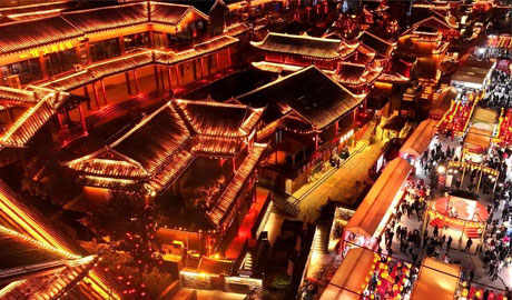An aerial drone photo taken on Feb. 17, 2026 shows tourists tasting local delicacies on a snack street in Xuan'en County, central China's Hubei Province. During the Spring Festival, lantern decorations across the country created a joyful atmosphere for the holiday. (Photo by Song Wen/Xinhua)