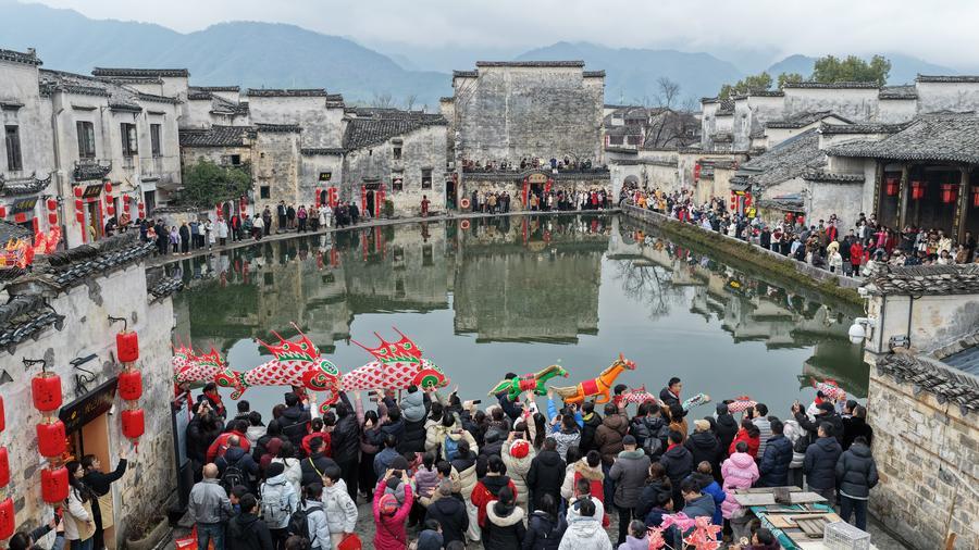 An aerial drone photo taken on Feb. 17, 2026 shows people attending a folk activity in Yixian County, east China's Anhui Province. (Photo by Wang Cheng/Xinhua)