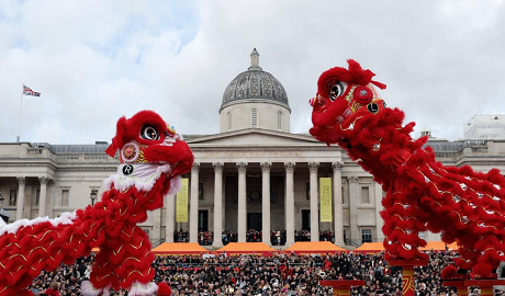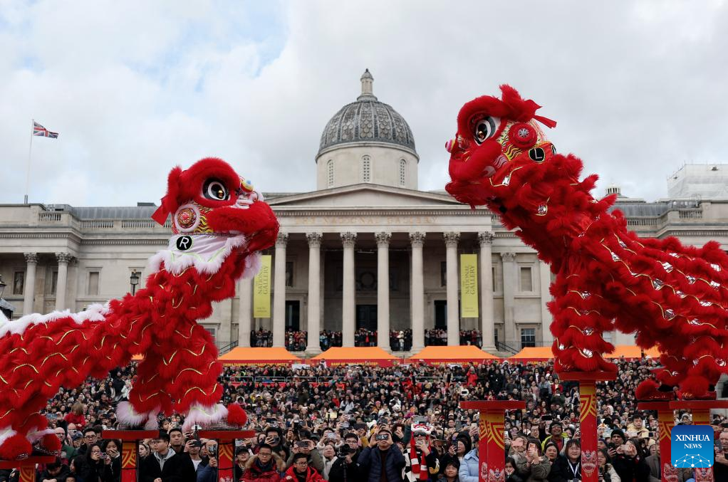 A lion dance is staged at Trafalgar Square to celebrate the Chinese New Year in London, Britain, on Feb. 22, 2026. (Xinhua/Li Ying)