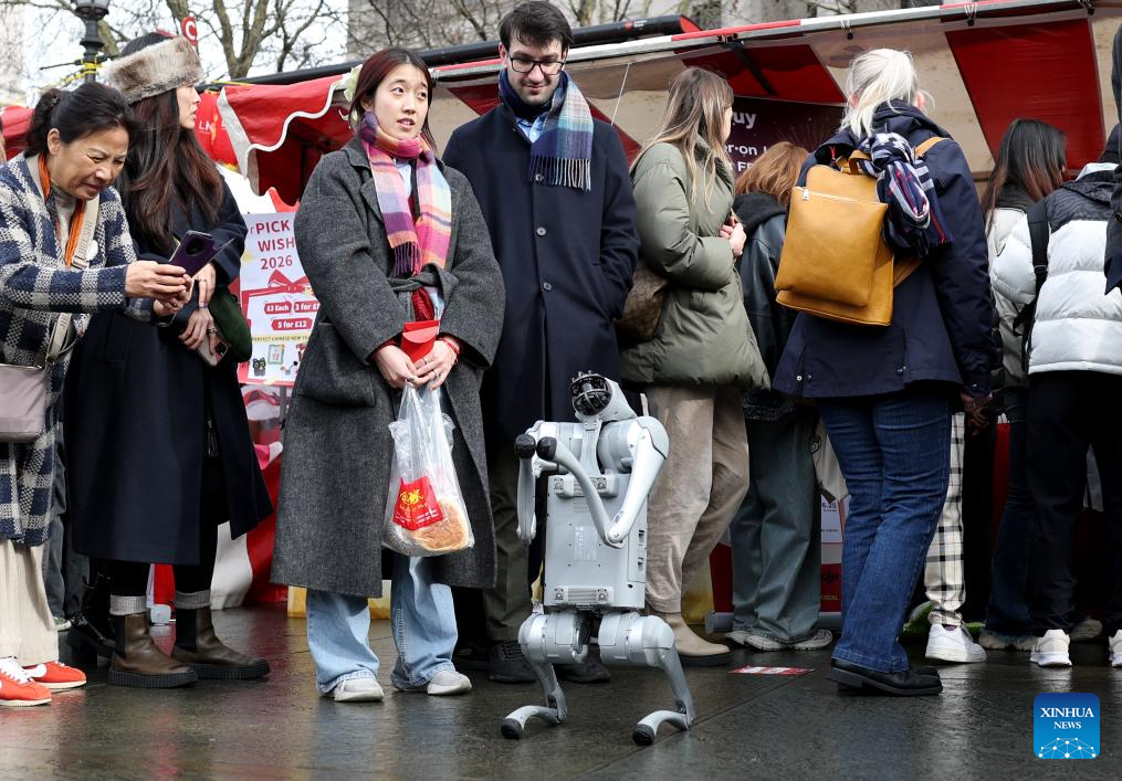 A robotic dog of Unitree Robotics greets people during the Chinese New Year celebration at Trafalgar Square in London, Britain, on Feb. 22, 2026. (Xinhua/Li Ying)