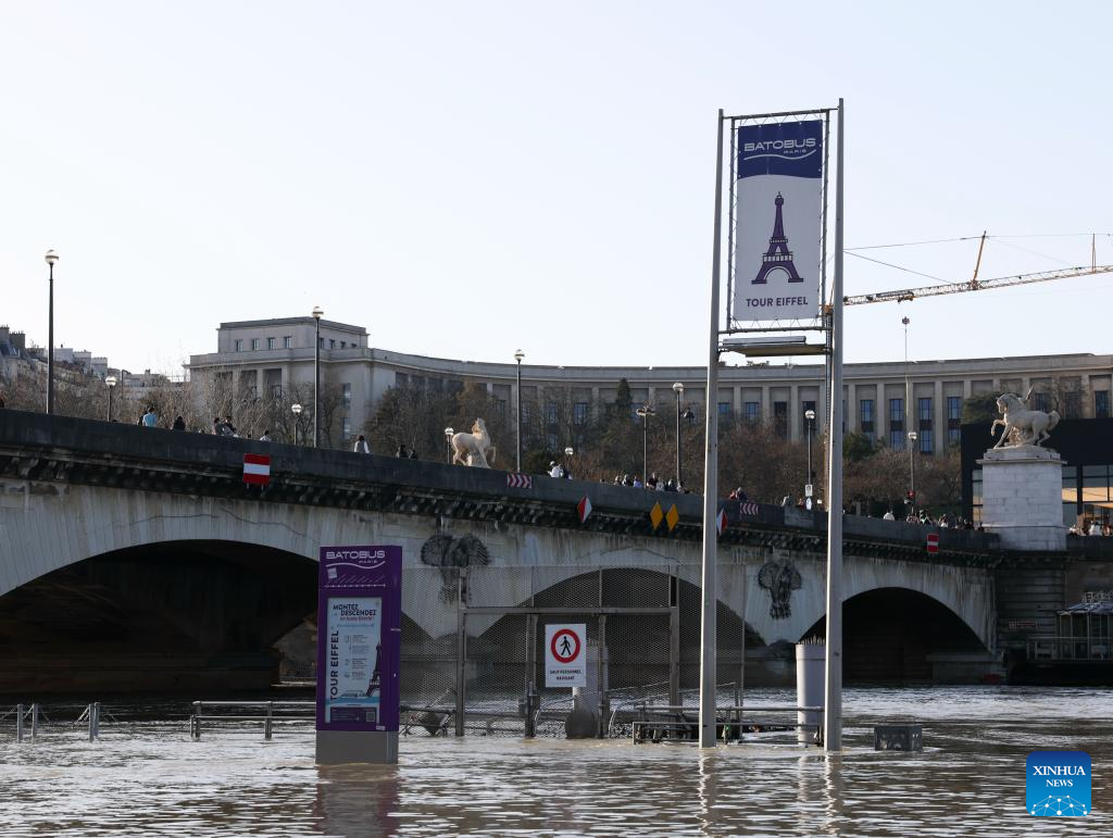 Photo taken on Feb. 25, 2026 shows flooded banks of the Seine River with the Eiffel Tower in the background in Paris, France. (Xinhua/Wu Huiwo)