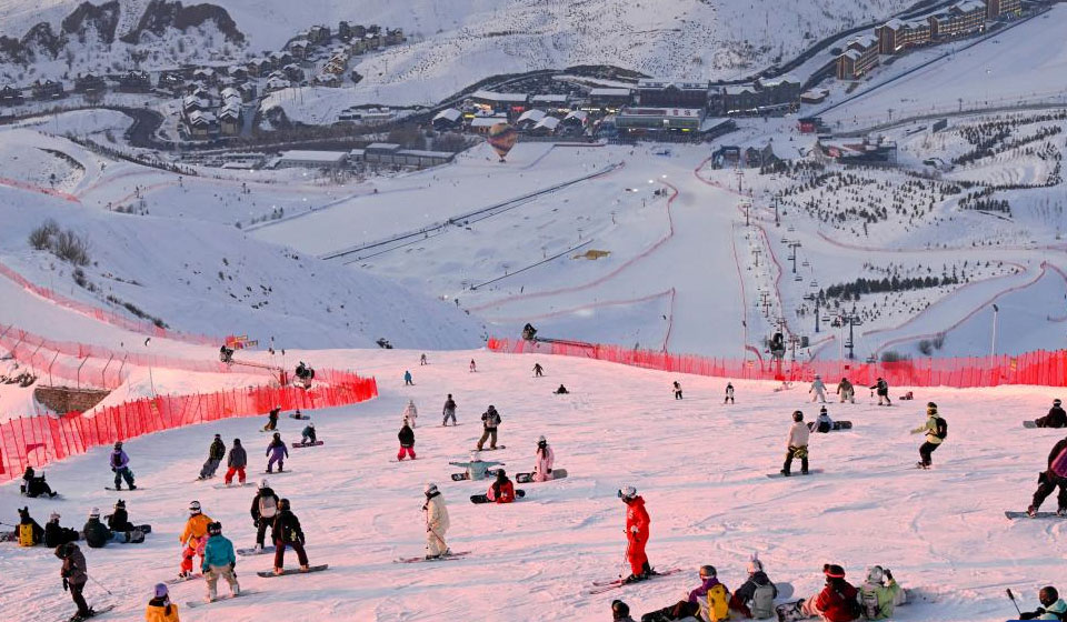 A drone photo taken on Feb. 25, 2026 shows ski enthusiasts enjoying a party around sunset at the Jiangjunshan International Ski Resort in Altay Prefecture, northwest China's Xinjiang Uygur Autonomous Region. Following the Spring Festival holiday, major ski resorts in Altay continue to witness strong popularity and steady visitor flows. The Jiangjunshan International Ski Resort has welcomed an average of 12,800 visitors on a daily basis after the holiday, around 8,700 of whom would enjoy skiing here. (Photo by Nurbek Nurman/Xinhua)