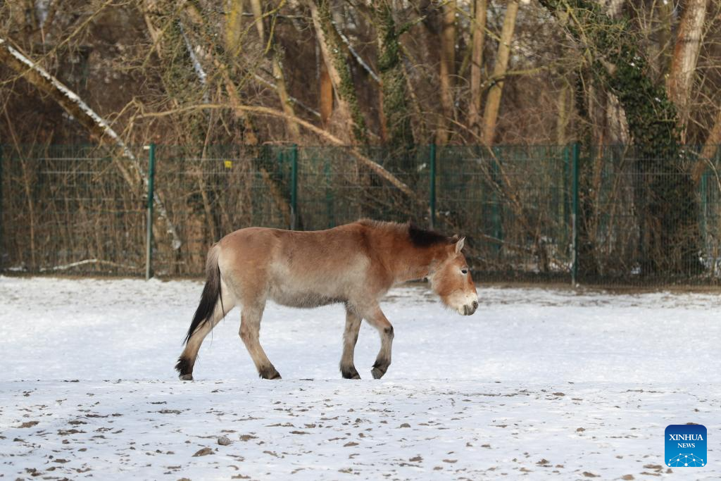 Przewalski's horse, the world's only remaining wild horse species, has an evolutionary history spanning over 60 million years. "They really like leaves," Martin Kraenzlin, curator of mammals at the park, told Xinhua. A keeper pushes a cart slowly across the snow, stops at the edge of the herd and adds bundle after bundle of hay, fresh branches, and even a Christmas tree.