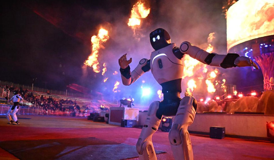 A humanoid robot performs during a myth-themed live-action show at a scenic area in Qingdao, east China's Shandong Province, on Feb. 26, 2026. (Xinhua/Li Ziheng)