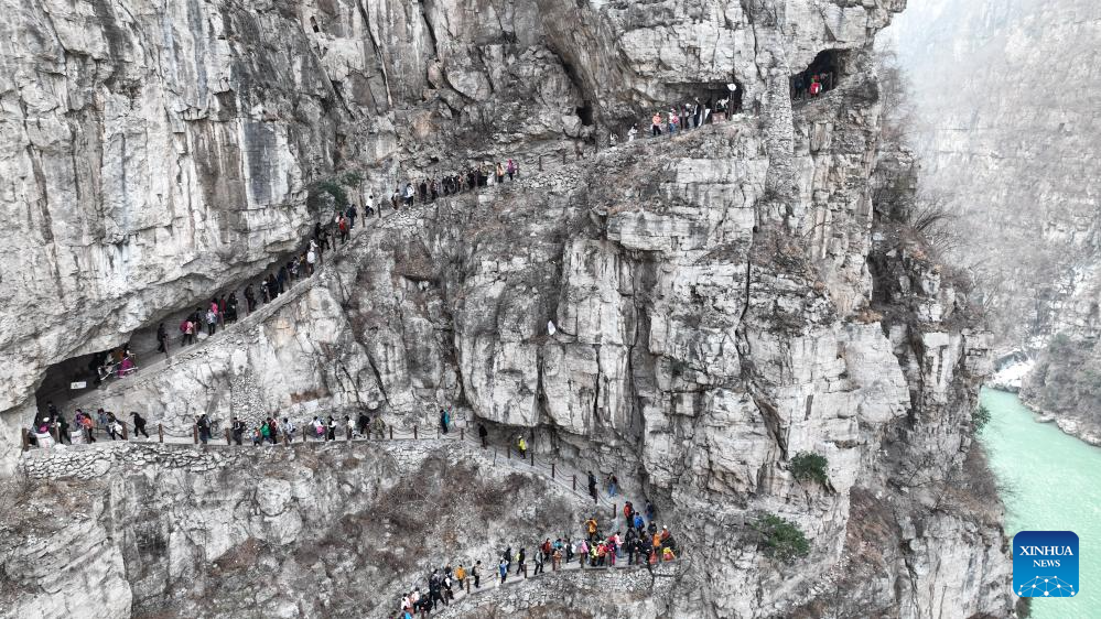 An aerial drone photo taken on March 16, 2024 shows tourists hiking in Gulu Village of Hanyuan County, southwest China's Sichuan Province.(Photo by Zhang Hongxin/Xinhua)