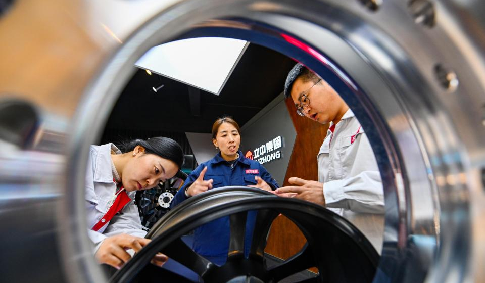 Guo Hongjing (C) talks with her colleagues at Tianjin Lizhong Wheel Co., Ltd. in north China's Tianjin, Feb. 25, 2026. (Xinhua/Zhao Zishuo)