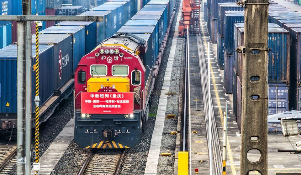 A drone photo shows a China-Europe freight train bound for Budapest, Hungary before departure at Tuanjiecun Station in Chongqing, southwest China, Nov. 30, 2025. (Xinhua/Tang Yi)