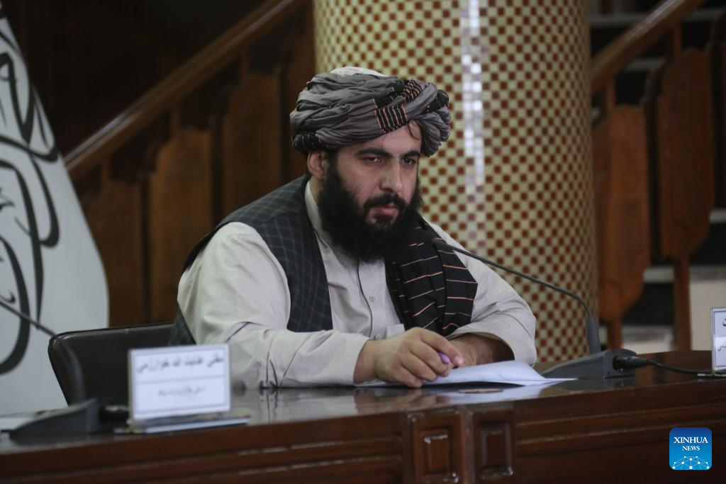 Deputy Afghan government spokesman Hamdullah Fitrat speaks during a press conference in Kabul, Afghanistan, March 3, 2026. At least 110 civilians, including 65 women and children, have been killed and 123 others injured in Pakistani airstrikes and mortar shelling across Afghanistan between Feb. 21 and March 2, Hamdullah Fitrat announced on Tuesday. (Photo by Saifurahman Safi/Xinhua)