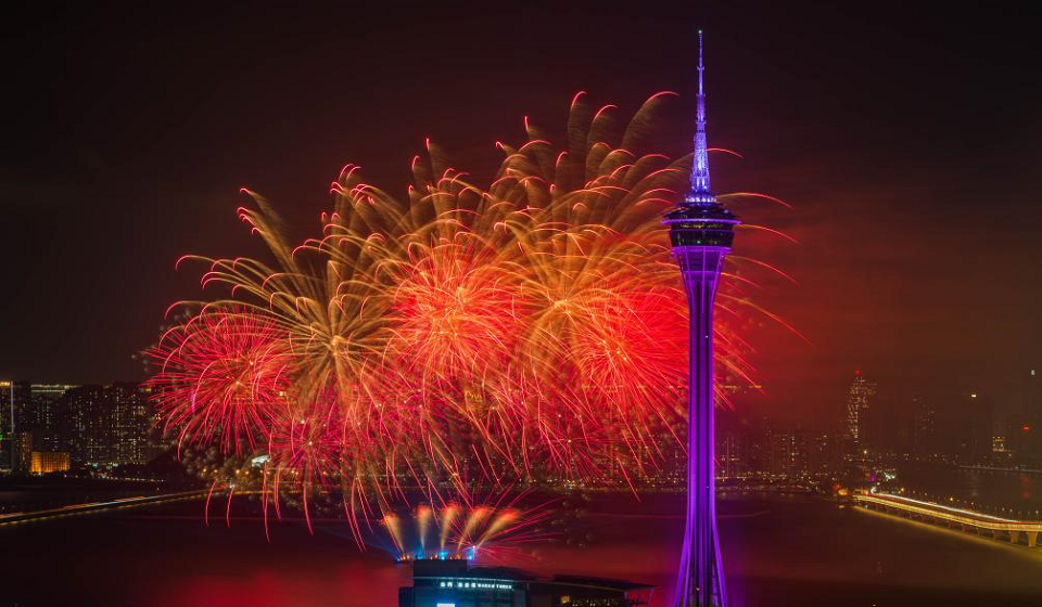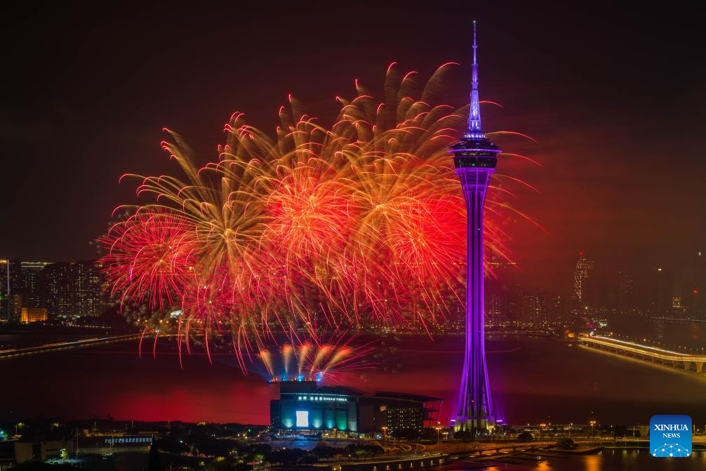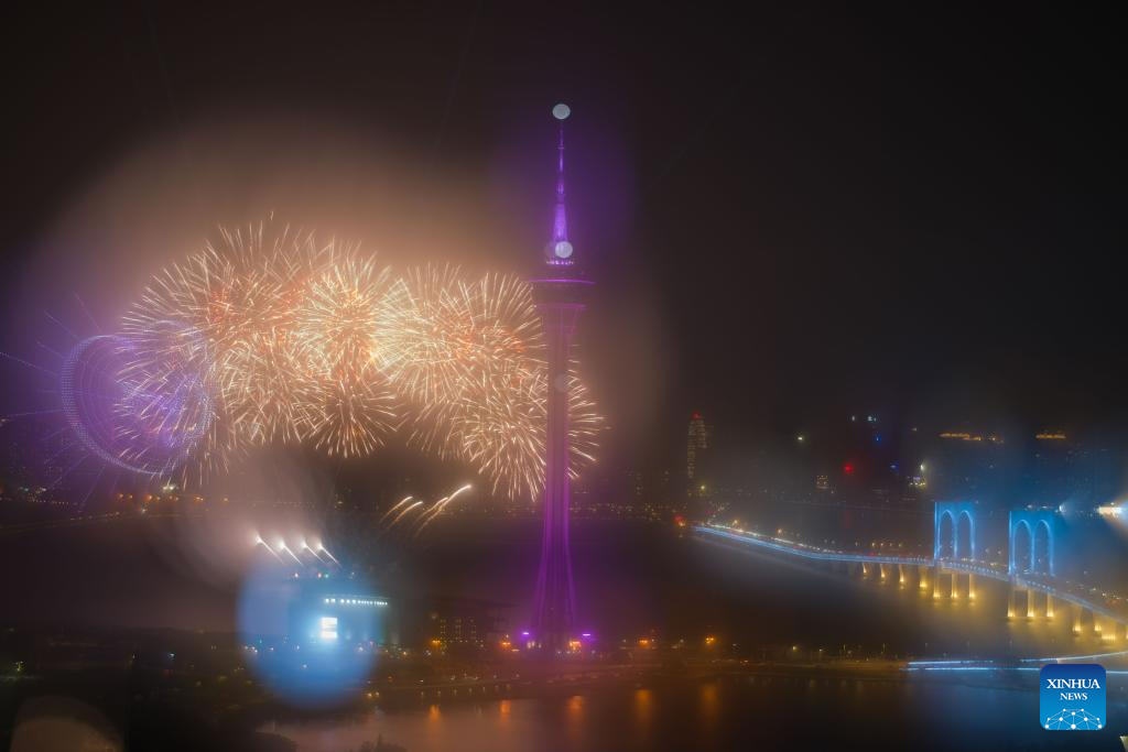 This photo taken on March 7, 2026 shows a fireworks show above the sea near Macao Tower in Macao, south China. (Xinhua/Cheong Kam Ka)