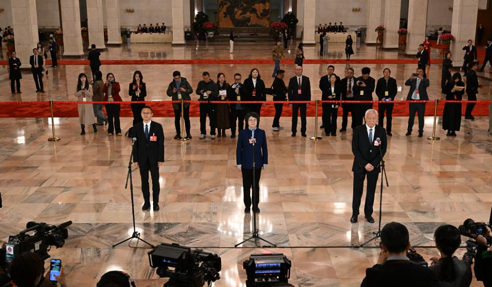 Members of the 14th National Committee of the Chinese People's Political Consultative Conference (CPPCC) attend a group interview ahead of the second plenary meeting of the fourth session of the 14th CPPCC National Committee at the Great Hall of the People in Beijing, capital of China, March 7, 2026. (Xinhua/Chen Yichen)