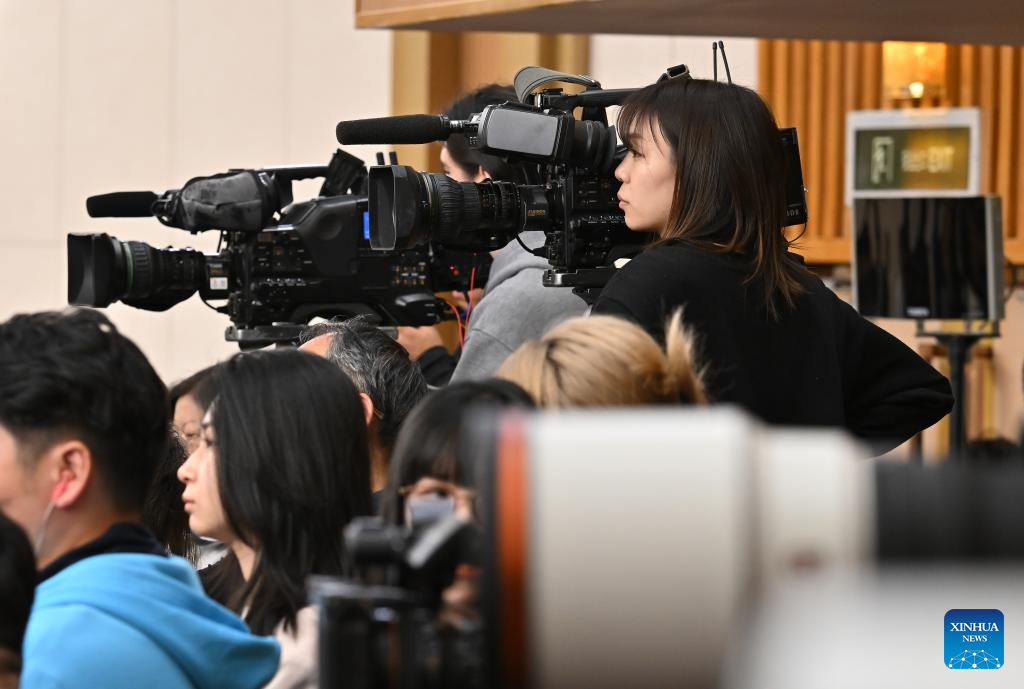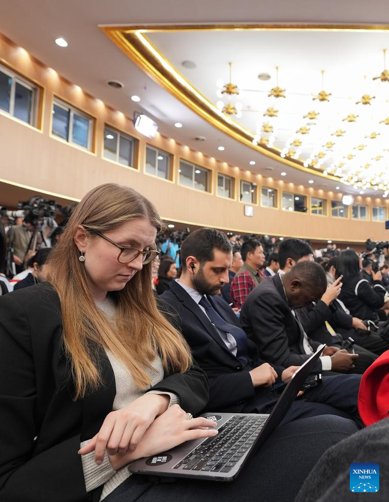 Journalists work at a press conference attended by Chinese Foreign Minister Wang Yi on the sidelines of the fourth session of the 14th National People's Congress (NPC) in Beijing, capital of China, March 8, 2026. Wang, also a member of the Political Bureau of the Communist Party of China Central Committee, answered questions of journalists from home and abroad on China's foreign policy and external relations during the press conference on Sunday. (Xinhua/Li Xin)