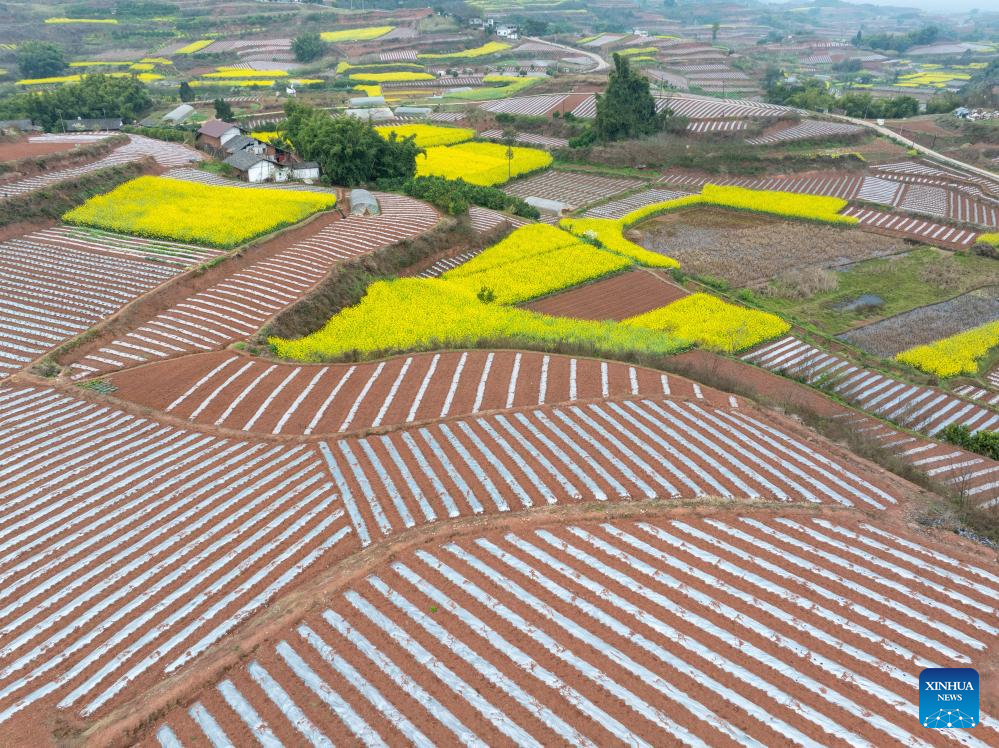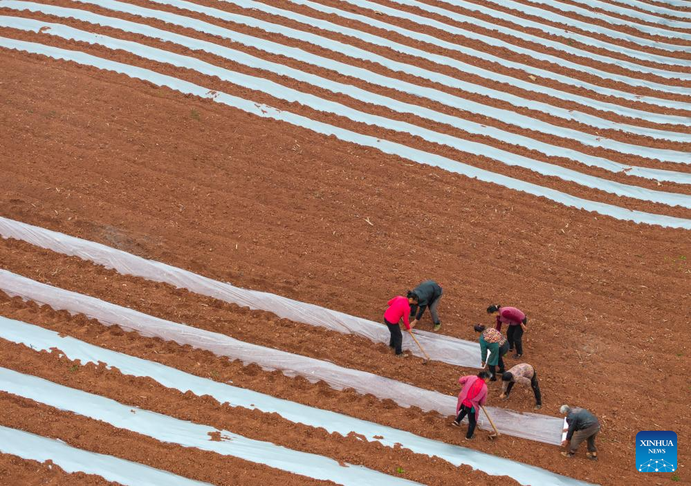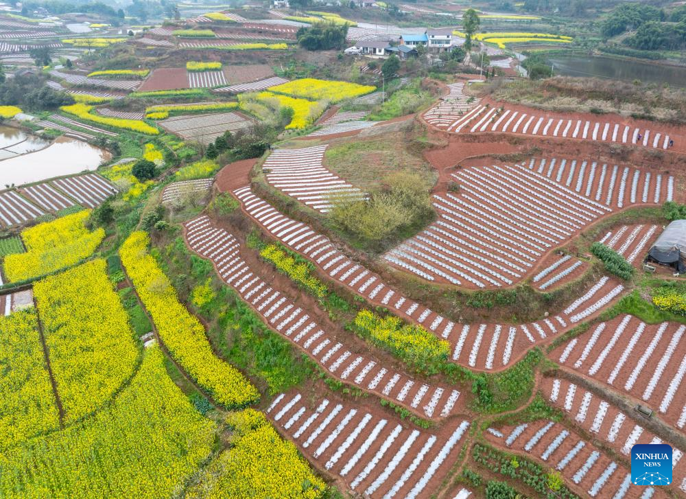 An aerial drone photo taken on March 6, 2026 shows farmers mulching at a field in Tiangongmiao Village, Lede Town, Rongxian County of southwest China's Sichuan Province. (Xinhua/Jiang Hongjing)