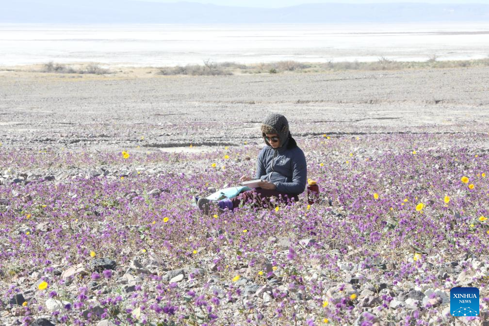 A tourist sits among the blooming wildflowers at Death Valley National Park, which straddles California and Nevada, in the United States, on March 6, 2026. The Death Valley National Park has welcomed a rare wildflower blooming these days. (Photo by Zeng Hui/Xinhua)