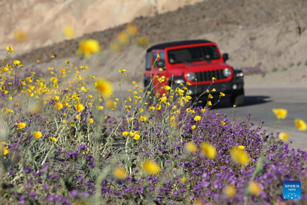 A vehicle drives into Death Valley National Park, which straddles California and Nevada, in the United States, on March 6, 2026. The Death Valley National Park has welcomed a rare wildflower blooming these days. (Photo by Zeng Hui/Xinhua)