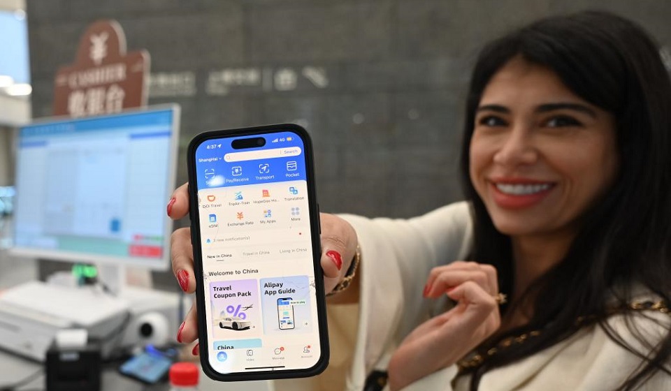 A foreigner shows her Alipay app at a shop in Shanghai, east China, May 28, 2025. (Xinhua/Chen Aiping)