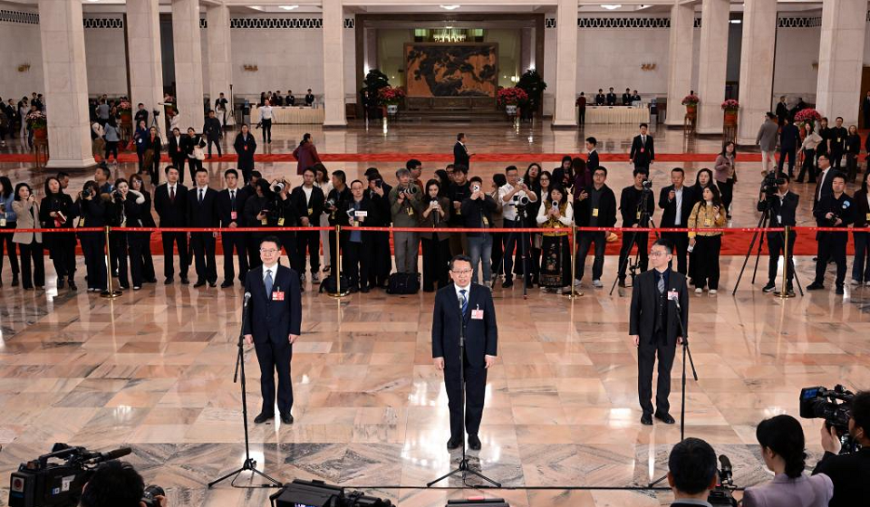 Journalists work at a group interview ahead of the closing meeting of the fourth session of the 14th National Committee of the Chinese People's Political Consultative Conference (CPPCC) at the Great Hall of the People in Beijing, capital of China, March 11, 2026. (Xinhua/Chen Yehua)