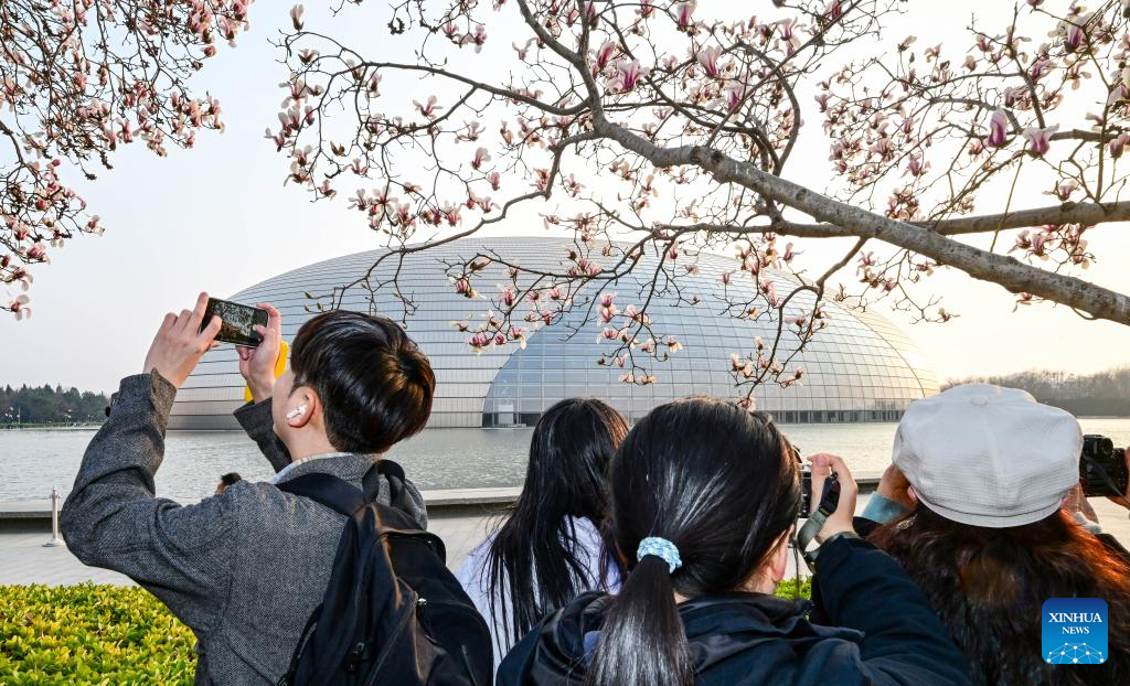 People take photos of magnolia blossoms near the National Center for the Performing Arts in Beijing, capital of China, March 12, 2026. (Xinhua/Chen Yehua)