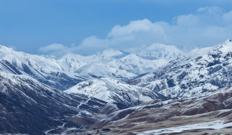 An aerial drone photo taken on March 15, 2026 shows the snow scenery in Maqen County of Tibetan Autonomous Prefecture of Golog, northwest China's Qinghai Province. The mountains covered in snow beneath the blue sky present a magnificent scene on the plateau. (Xinhua/Zhang Long)