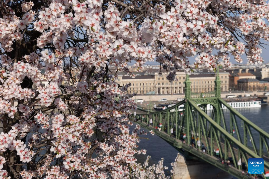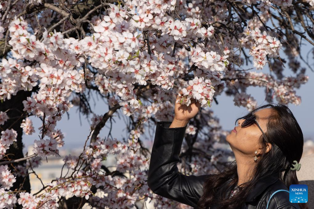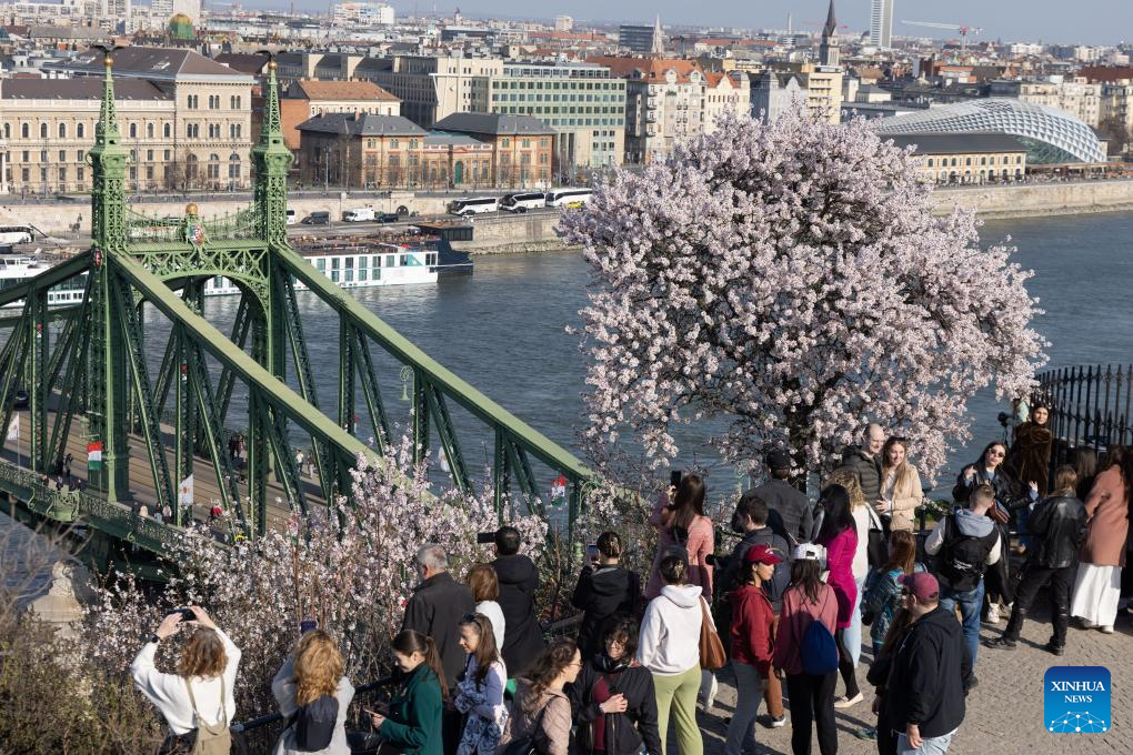 People enjoy blooming almond trees in Budapest, Hungary on March 14, 2026. (Photo by Attila Volgyi/Xinhua)