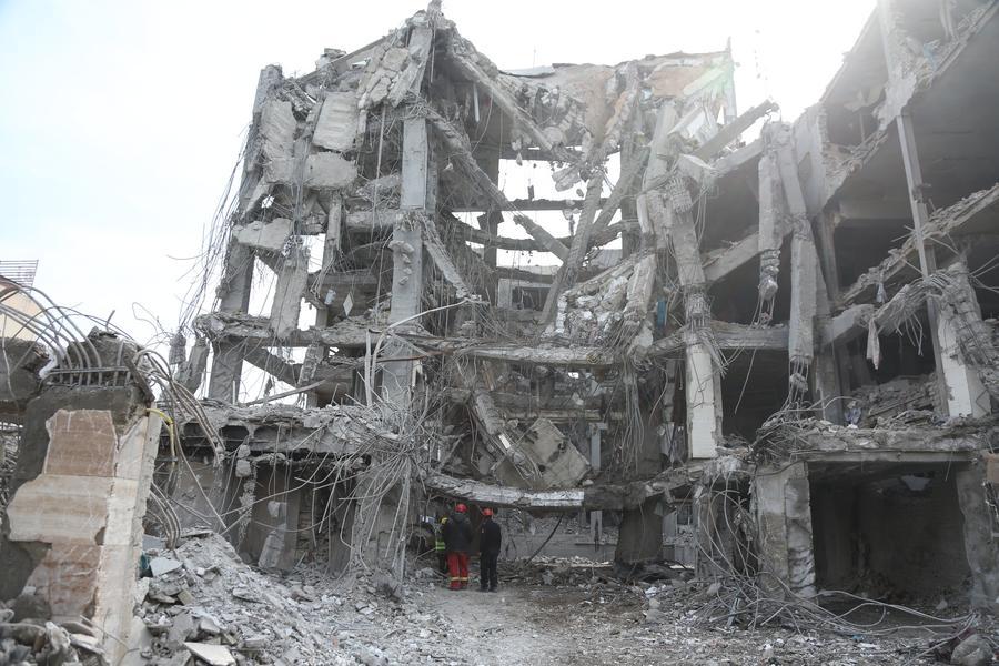 People work before damaged buildings in Tehran, Iran, March 12, 2026. (Xinhua/Shadati)